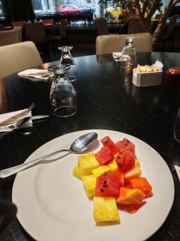Gut gefrühstückt. Ich genieße die Berge von Obst. Das bringe ich so zuhause überhaupt nicht auf die Reihe. Ananas, Pfirsiche, Melonen und was weiß ich frisch geschnippelt. Da könnte ich mich reinknien.