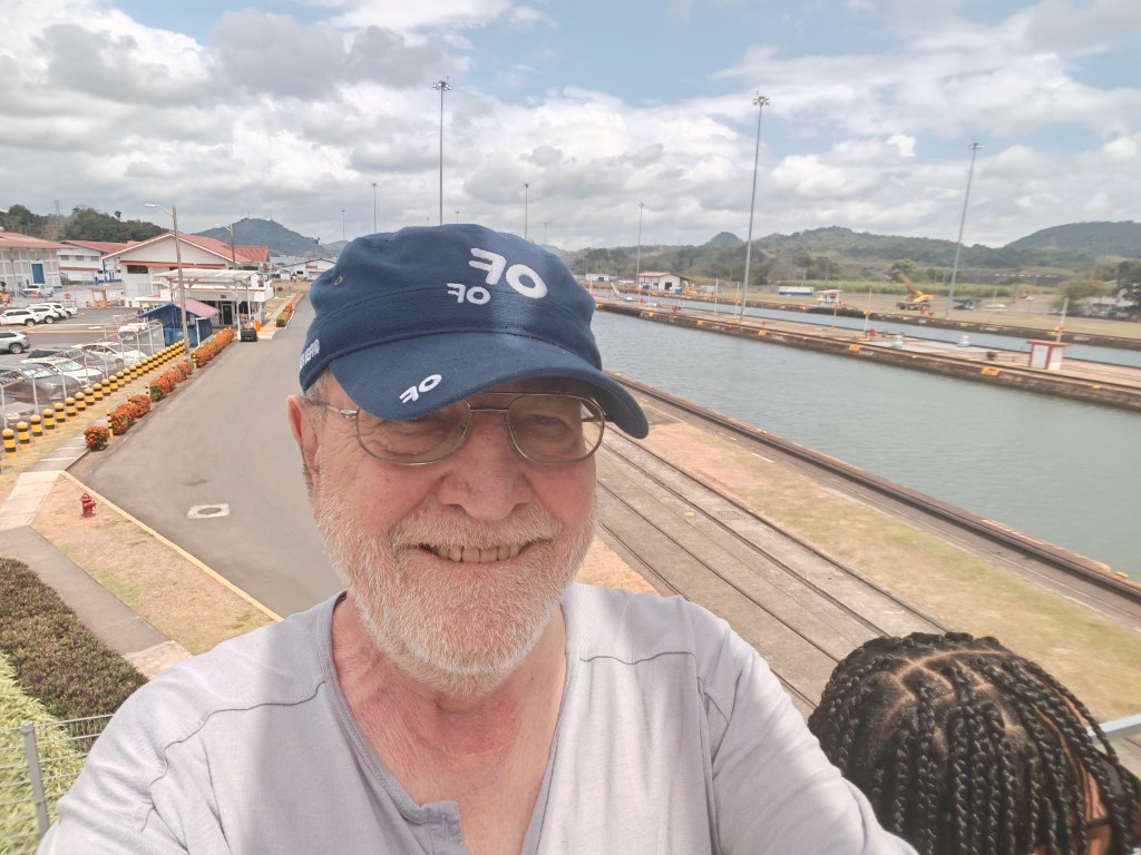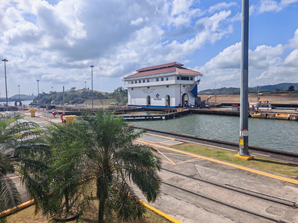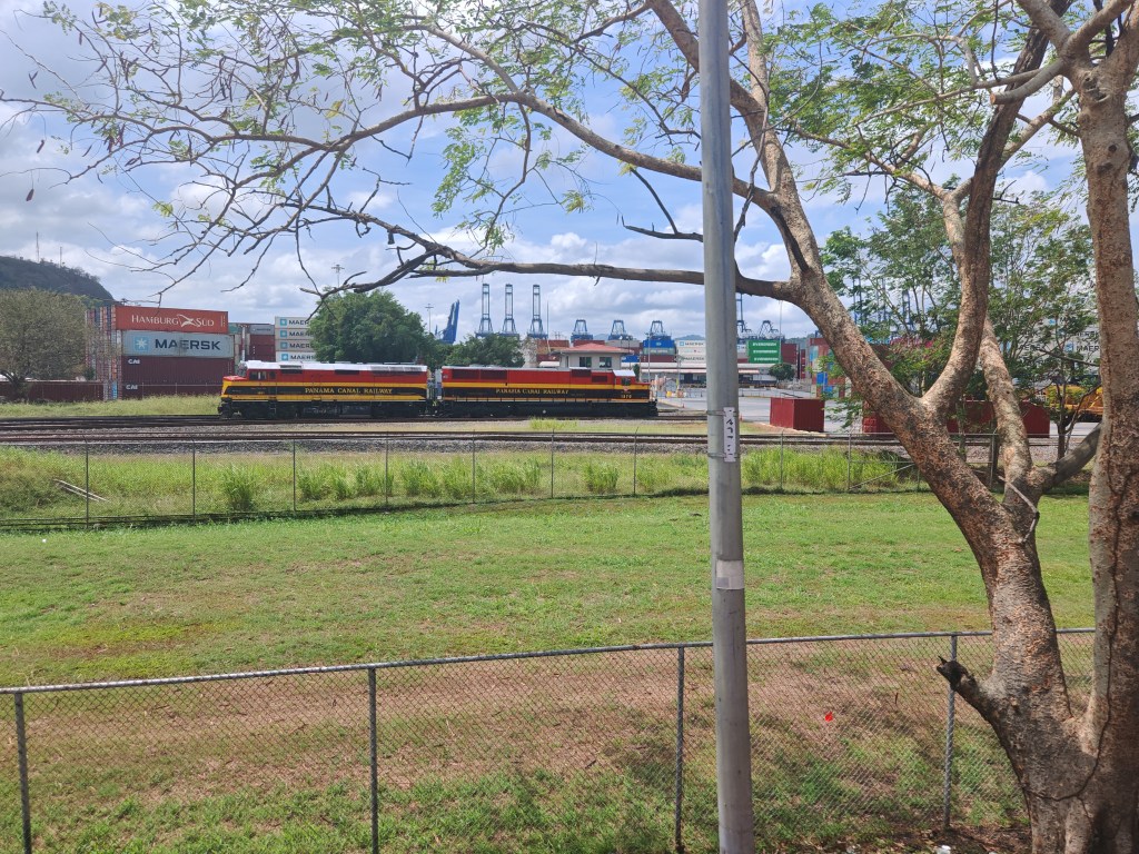 Vom Kanal sehe ich leider nur einen Moment das Wasser, aber der Bus hält an einer Schleuse nebst riesigem Besucherzentrum. Da werde ich morgen Station machen. Ansonsten sehe ich Container satt. Es gibt eine Bahnlinie entlang der Wasserstraße. Möglicherweise werden die Container von Jumbo-Tankern, die nicht nur Kanal passen, per Bahn vom Ozean zum Pazifik transportiert.