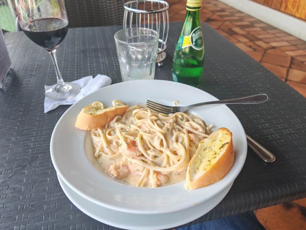 Die Hop-on Hop-off Fahrzeuge in Panama sind die schlechtesten die ich auf dieser Welt genutzt habe. Annähernd schrottreif mit einer Tonanlage über die ich auch in Deutsch nichts verstanden hätte. Das Lokal jedenfalls erfüllte die Erwartungen voll. Nach hinten noch auf ein Strand, Pool etc. Ich bestelle Nudel mit irgendeiner Soße von hier.