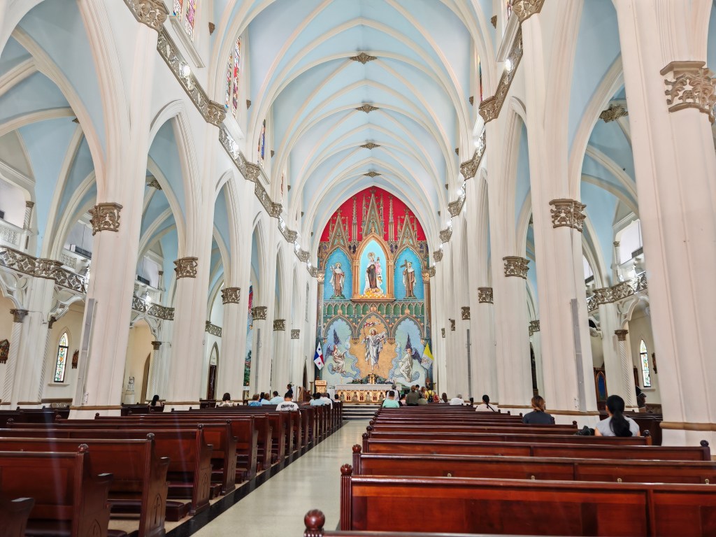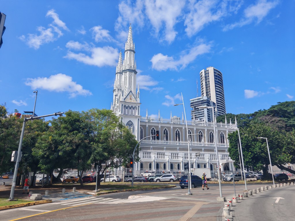 Es ist die Kirche Parroquia La Virgen Milagrosa direkt am Kennedy Park und ist Teil des Kulturerbes der Stadt. Die Statue der Jungfrau Maria ist mit LED angeleuchtet. Mir persönlich gefallen eher die schönen bunten Kirchenfenster.