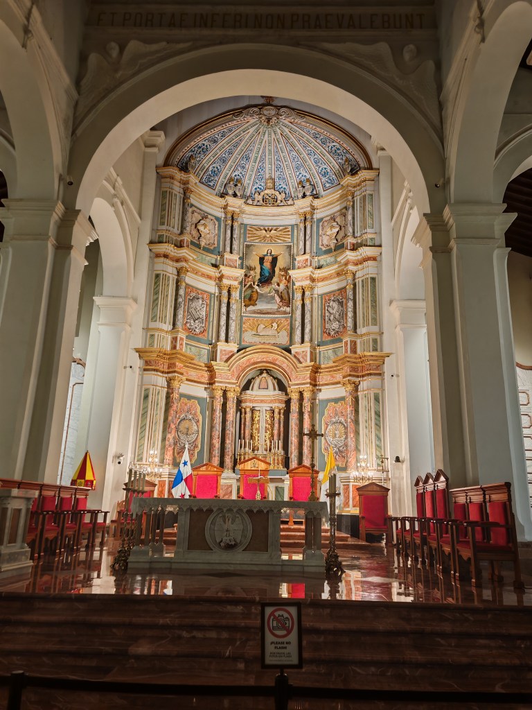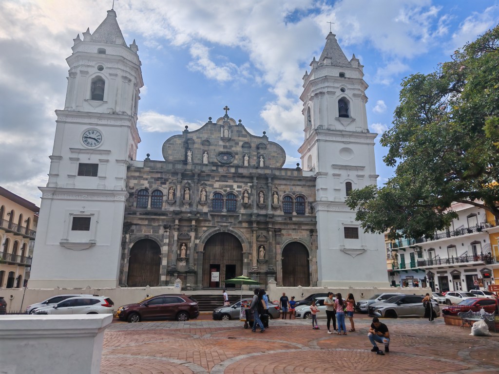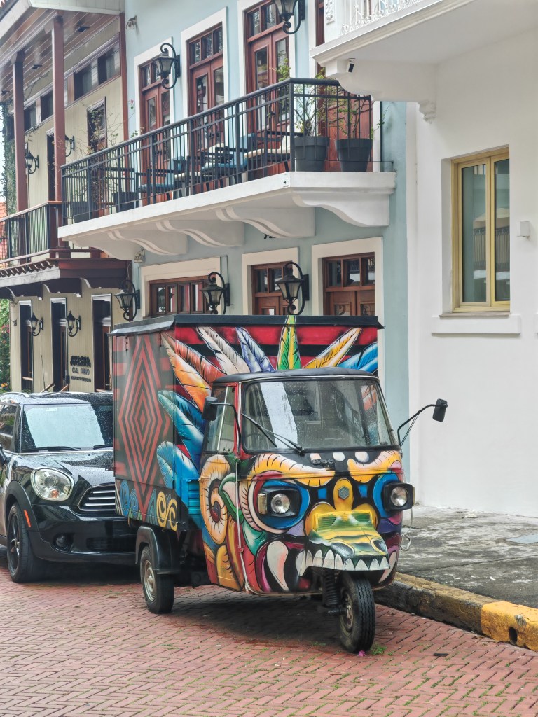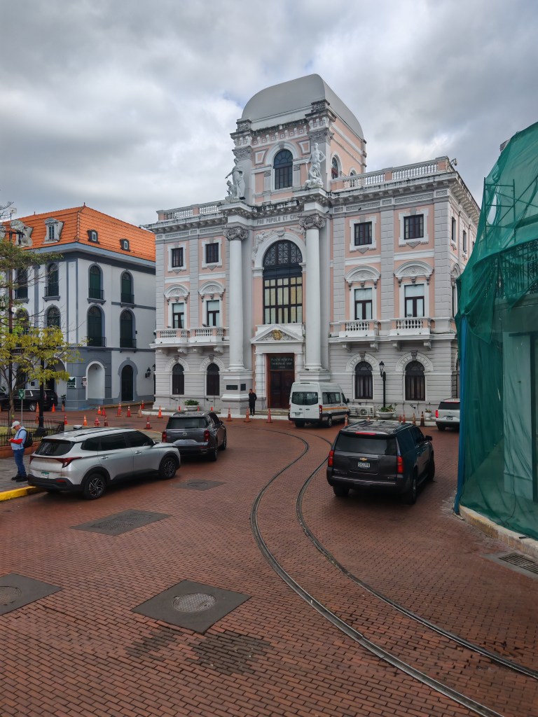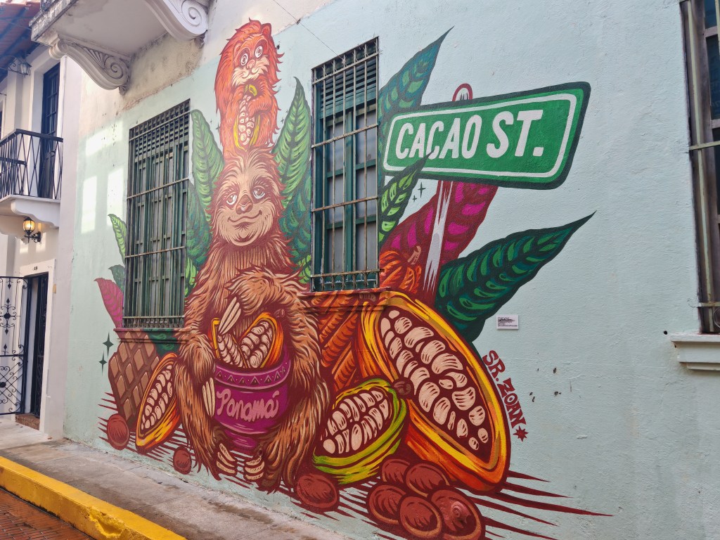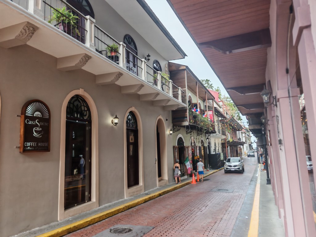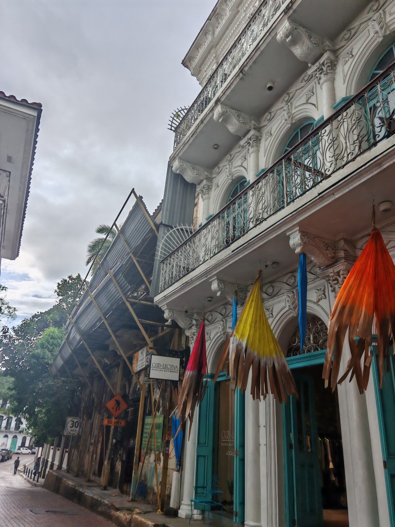 Draußen stromere ich durch die Gassen der Altstadt. Es gibt einen Laden mit Panama Schokolade und eine Gasse mit Panama-Hüten. Claudia schrieb mir auf meinen Post eigentlich würden die meist in Ecuador gefertigt. Die hier sind wohl meist aus China. An der schönsten Stelle der Altstadt Regierungsgebäude. Der Präsident sitzt wohl hier mit einem unbezahlbaren Blick über das Meer auf die Skyline. Mich begeistert mit welche Sorgfalt das Ensemble auf einem Quadratkilometer erhalten ist. Die vielen Bagger zeugen davon, dass an der Historie weitergearbeitet wird. Ein wenig stören die vielen Autos. Parkplätze sind rar und alle drehen die große Runde solange bis nichts mehr geht.
