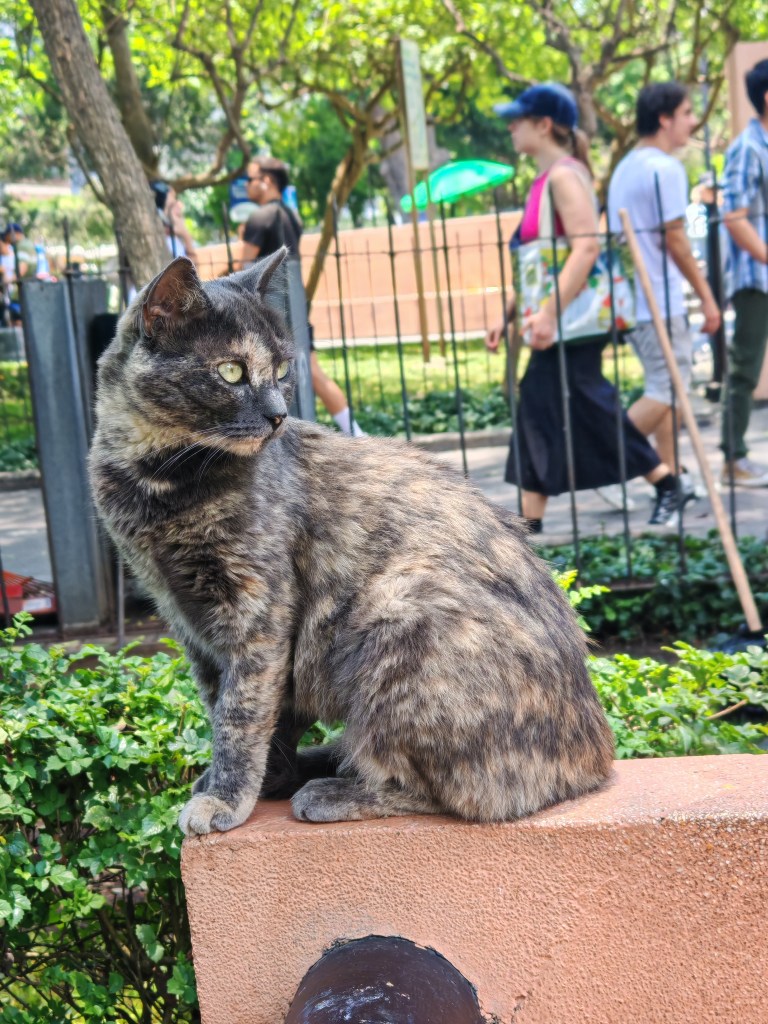 Der Kennedy Park ist eine riesige Grüne Oase mitten in der Stadt. Hier kreuzen sich Wege, hier finden Menschen eine viertel Stunde Muse in dem hektischen Treiben. Ringsum sind Geschäfte, Cafés, Restaurants. Was mir auffällt: es laden viele Bänke zum Sitzen ein. Bei uns werden sie aus Angst das Penner sie bevölkern abgebaut. Trotzdem ist es sehr schwer einen Platz zu finden. Um die Mittagszeit -Siesta sagt man hier- herrscht Hochbetrieb. Überall sitzen Menschen aus der Nachbarschaft dicht an dicht. Schließlich gelingt es mir ein Plätzchen zu ergattern um meiner Lieblingsbeschäftigung nachzugehen: Leute gucken. Aber auch ich werde beobachtet: von einer Mietz.