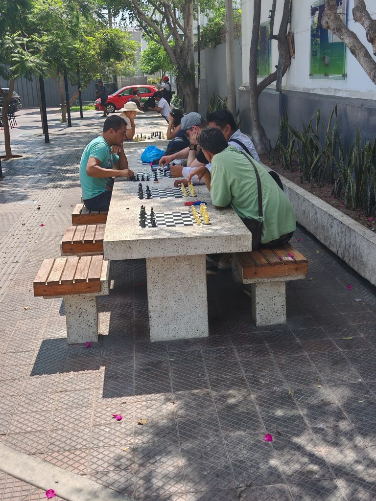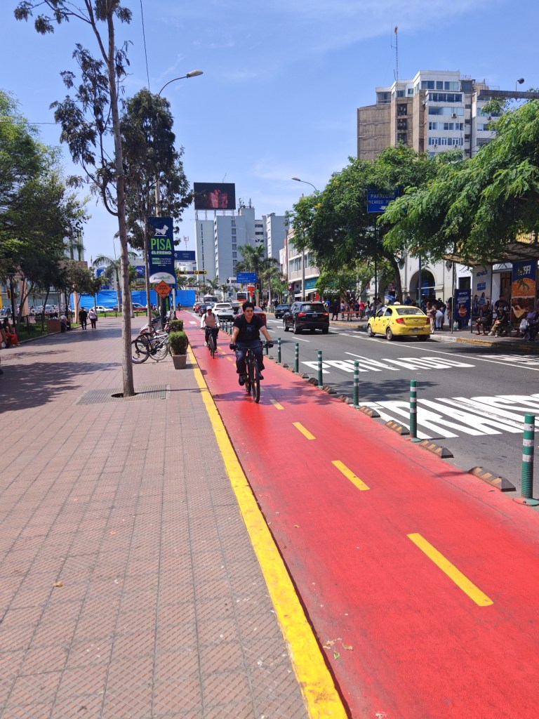 Nach dem Frühstück beginne ich eine kleine Stadttour. Ich wohne im Stadtteil Miraflores direkt an der Küste. Es ist das Amüsierviertel der Stadt, hier lebt die Mittelschicht. Ungezählte kleine Cafés, Restaurants, Sandwichbuden und kleine Boutiquen. Alles wirkt gepflegt. Ein sehr sicherer Stadtteil habe ich gelesen. Der Preis dafür sind Heerscharen von Security. Quasi vor jedem Eingang zwei. Überall hohe Gitter, Rolltore. Der Beamte an der Passkontrolle hatte mich gefragt, wo ich wohne: Als ich Miraflores sagte, hat er mich durchgewunken.