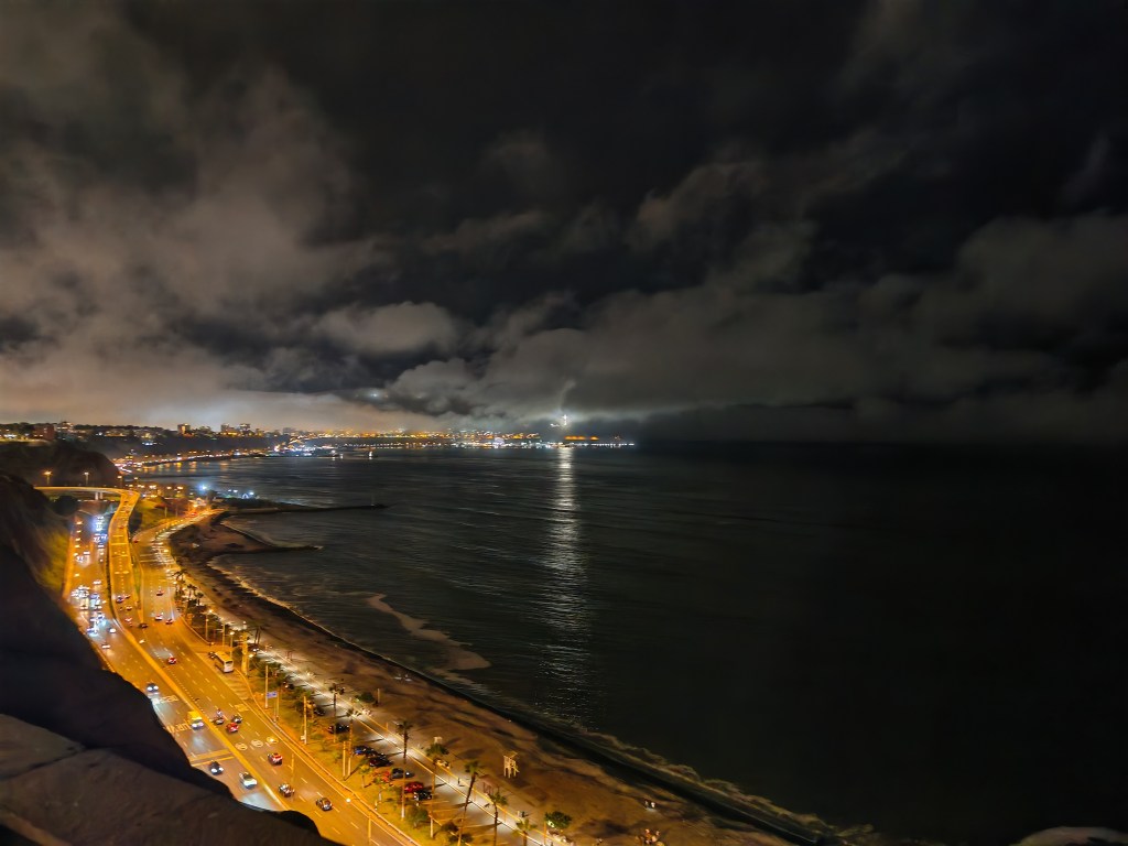 Die große Überraschung: Lima liegt an einer Steilküste. Der Bus fährt auf einer Schnellstraße entlang am Ufer und am Strand. Links Meer, rechts eine Wand: 80 bis 100 Meter hoch. Einige Fußwege mit vielen Serpentinen winden sich durch die Felsen. Da Linksabbiegen in dem Chaos schwierig ist: fährt der Bus immer rechts, rechts, rechts, also riesige Umwege. Aber er hält 50 Meter von meinem Hotel entfernt. Ein Best Western, eher einfach aber sauber und mit einem netten und kompetenten Staff. Mein Zimmer überrascht. Vom Bett blicke ich über die Weite des Pazifik.