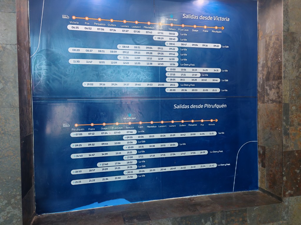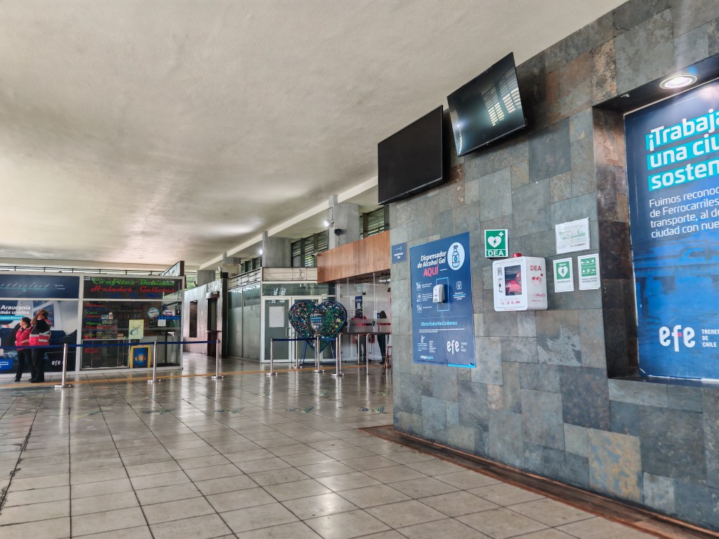 Heute will ich soweit wie möglich in den Süden fahren. Zunächst vier Stunden und vierzig Minuten bis Chillan. So weit fährt der einzige Hochgeschwindigkeitszug (naja) in Chile. Das sind rund 400 Kilometer. Danach möchte ich noch möglichst weit mit dem Bus fahren. Der (Fahr-)plan ist relativ eng getaktet. Es darf nichts passieren. Ein Hotel habe ich auch noch nicht gebucht. Vorweg: So ganz hat es nicht geklappt.