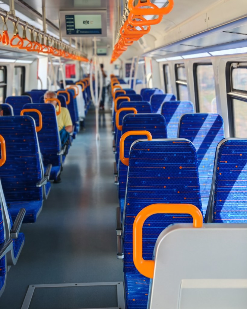 Die Triebwagen sind neu und modern. Die Frau in dem Werbefilm über diese Bahn, der drinnen auf dem Screen gezeigt wird ist meine Schaffnerin. Whooow. Sie verkauft mir das Ticket für die Rückfahrt im Zug. 90 Minuten Spaß und die Landschaft genießen.
