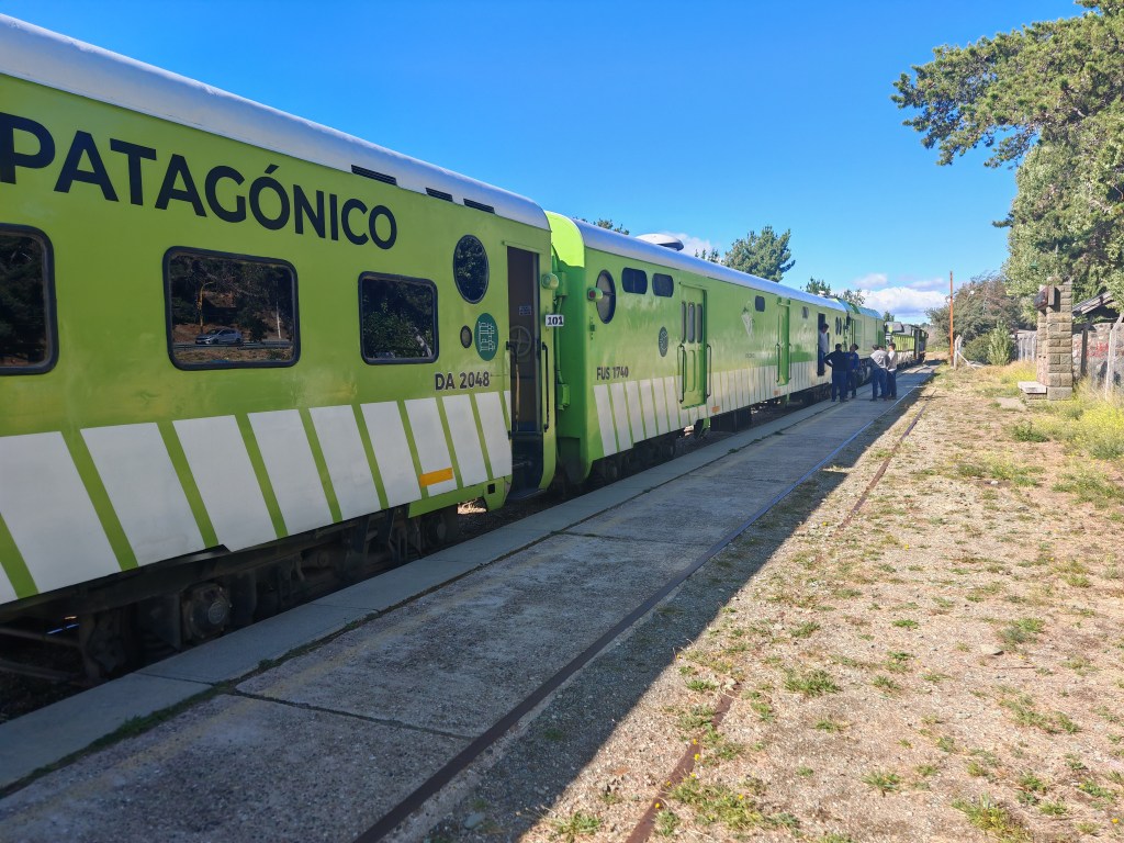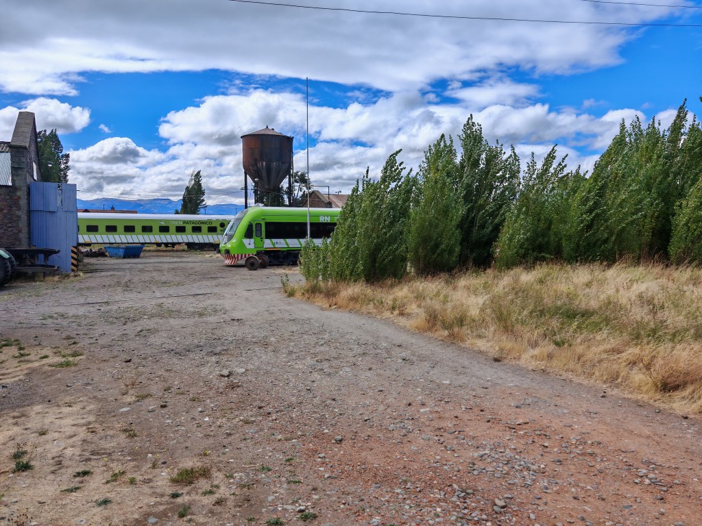 Auf dem Abstellgleis hinten steht mein Patagonien-Express. Der Triebwagen im Vordergrund befördert einmal in der Woche Gäste zwei Stunden weit in die Berge zu einem Dinner im Zug.