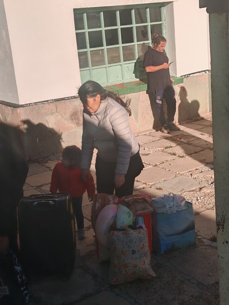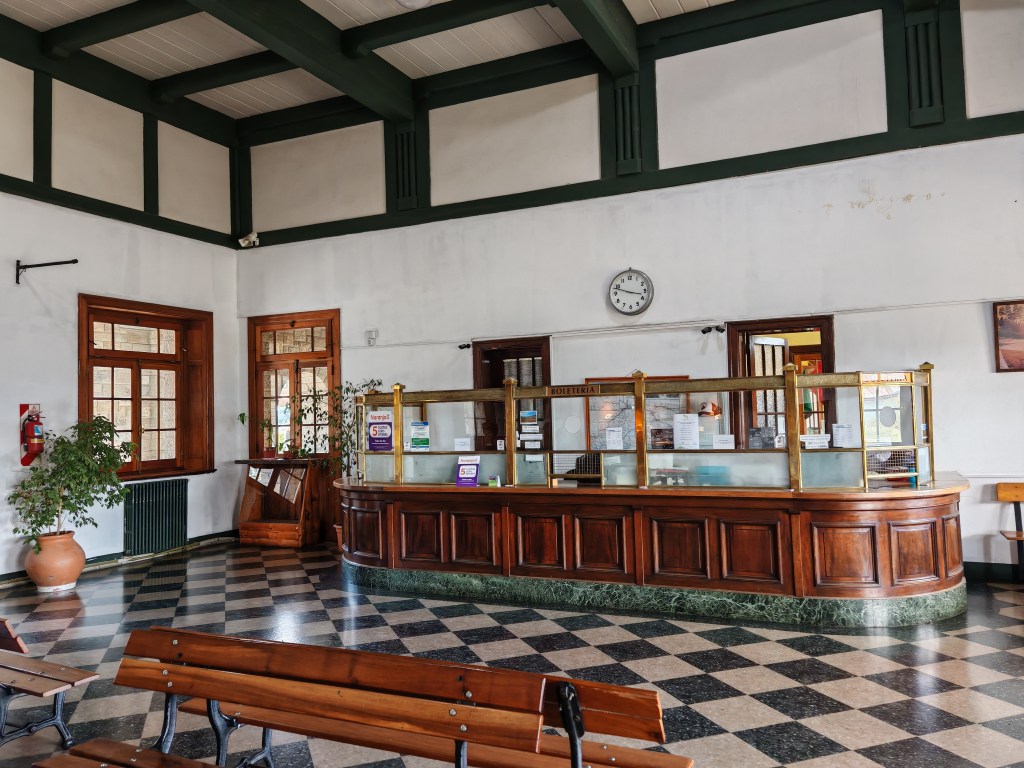 So mag die Schalterhalle schon vor 100 Jahren ausgesehen haben. Ein Zug aber drei Leute hinter dem Schalter von morgens acht bis abends um sechs. Die Tickets werden fast ausschließlich über Internet verkauft und sind innerhalb von Stunden vergriffen. Mit Matthias Schulze hatte ich mich über den Arbeitsmarkt hier ausgetauscht. Er hat dazu veröffentlicht, beschrieben wie der informelle Sektor wächst aber gleichzeitig die Leute die einen festen Job haben, stark abgesichert sind, auch wenn die Grundlagen für ihre Arbeit ganz oder teilweise entfallen. Aber eines muss man Patagonia tren lassen: es ist tiptop sauber. Und der Bahnhof hat ein super schnelles Wlan in 5g. Und im Gegensatz zum Stadtbüro, wo auch jemand den ganzen Tag Zeit hat sein Handy zu quälen, wissen die hier super Bescheid. Ich soll um 15.30 Uhr hier sein. Um 16 Uhr fahre der Zug. Das ist jetzt die dritte Abfahrzeit die mir genannt wird.