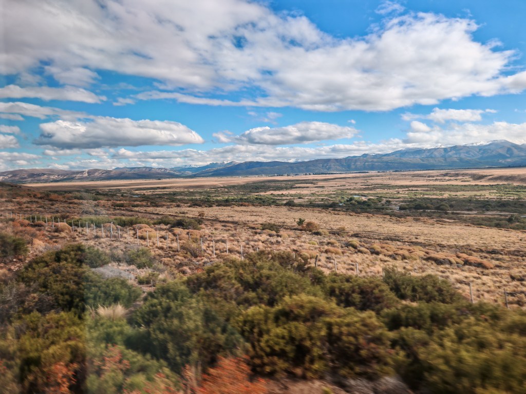 Punkt 17 Uhr winkt der Schaffner mit der Grünen Fahne. Abfahrt. Ich habe einen Fensterplatz. Das Panorama ist spektakulär. Eine karge Hochebene, manchmal von einem kleinen Fluss unterbrochen. Eingerahmt von Bergen und schneebedeckten Gipfeln.