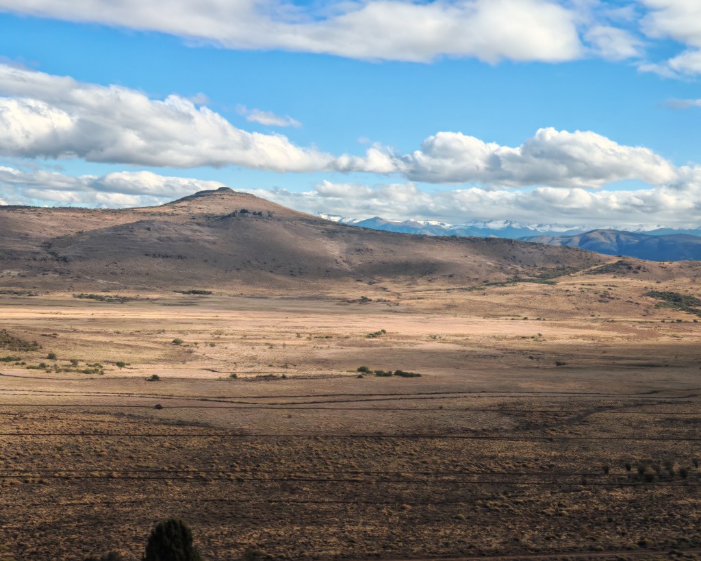 Wir verlassen den Pan American Highway Richtung Anden. Die Landschaft erinnert ein wenig an eine Mischung aus Rhön und Voralpenland. Landwirtschaft dominiert. Viehzucht und ein wenig Ackerbau. Die Bauern hier haben Hecken gepflanzt um der Bodenerosion vorzubeugen, so wie ich das von meiner Jugend in der Rhön kenne. Kleine Wäldchen lockern das Landschaftsbild auf, Es ist Herbst. Überall warten Heuballen darauf abgeholt zu werden. Sie garantieren, dass das Vieh auch im Winter satt wird.