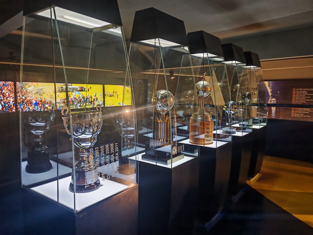 Museum und Stadionführung ist ein Muss: Ein Muss das eher enttäuscht, obwohl unser Guide, keine 25 Jahre alt, ein Naturtalent ist. Spanisch, Portugiesisch, Englisch, Französisch und ein paar Brocken Deutsch: Alles kein Problem. Zu Beginn fragt er nach den Nationalitäten der etwa 50 Teilnehmer: ich bin erstaunt: Ganz Südamerika und viel Europa. Auch ein Paar aus Mönchengladbach ist dabei. Unser Guide kann natürlich sofort drei Spieler aus der Fohlenmannschaft aufzählen und ich komme wieder einmal zu drei Sätzen in meinem Heimatidiom. Wenigstens kennen die Gladbacher Kickers Offenbach, die gerade, wie ich parallel auf OP-Online verfolge, den Pokal gegen Borussia Fulda vergeigen. Wird es denn nie hell auf dem Parkett sang einst schon Wolfgang Niedecken. Er muss den OFC gemeint haben.