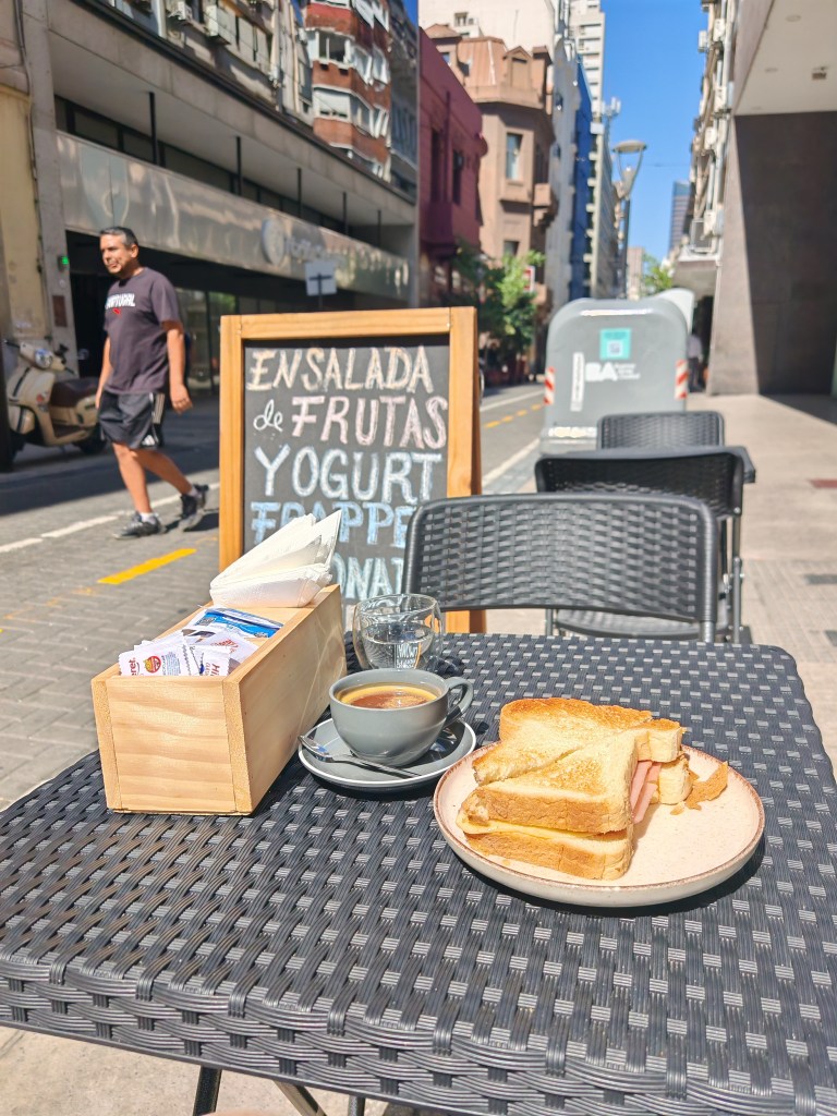 Nach den Bewertungen soll das Frühstück im Hotel reichhaltig und gut sein. Ich habe trotzdem kein Breakfast gebucht, denn in einer Stadt wie Buenos Aires möchte ich auch beim Morgenmahl Abwechslung und die kleinen Bars in der Umgebung ausprobieren. Heute am Sonntag sind leider die meisten geschlossen. Drei Blocks weiter hat ein Mini-Cafe offen, keine acht Quadratmeter groß, zwei Tische draußen und drinnen eine Sitzbank am Fenster mit zwei Hochstühlen. Ich lerne erst mal: im Offenbacher Dialekt ein Sandwich zu bestellen, macht hier wenig Sinn. Ausgesprochen wie „Sand“, versteht hier niemand. Saaandwich belehrt mich der Chef. Aha. Jedenfalls in der Version Schinken / Käse schmeckt es richtig gut und der Kaffee ist was besonders. Er riecht in Südamerika immer ein wenig nach einem Schuss Kakao.