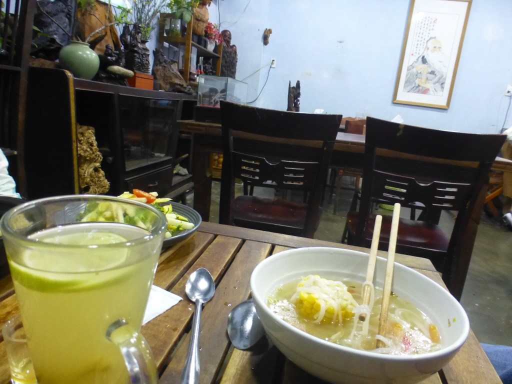 Also gibt es zu meiner Pho Ginger-Tee. Kann man auch trinken. Ich wundere mich wie wenig hier los ist. Wir sind kaum 100 Meter vom Laufsteg in der Altstadt entfernt, auf dem sich die Menschen drängen. Hier eher ein ruhiges Publikum, meist Europäer.