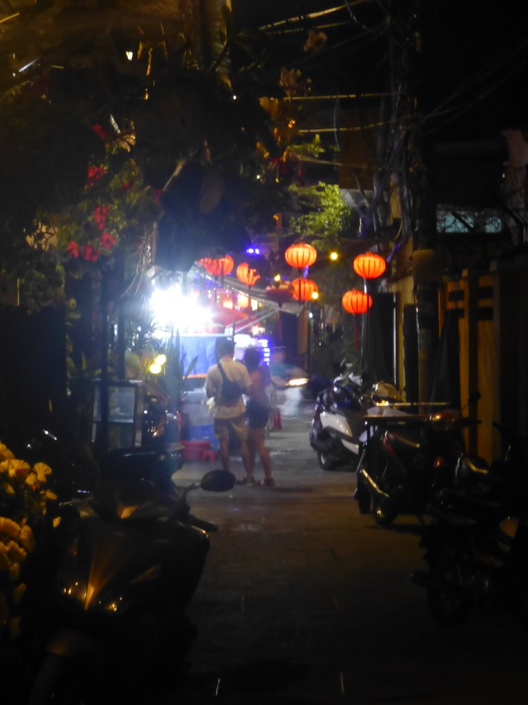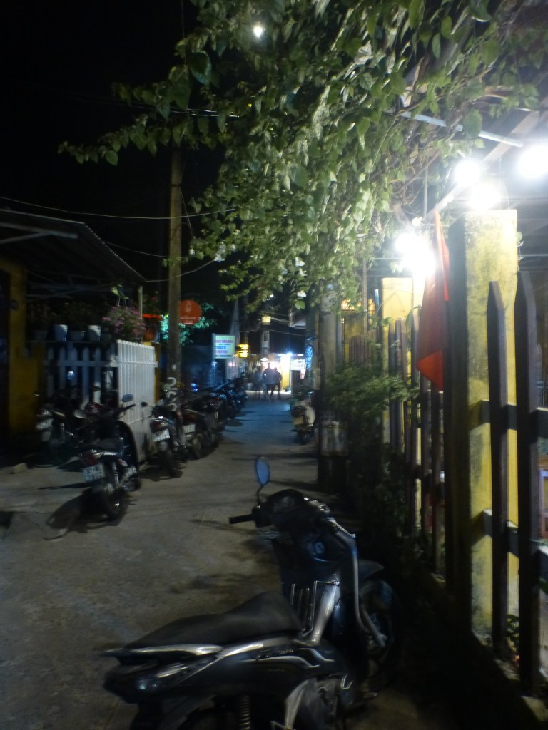 Mittags ruhen und packen. Wir haben uns entschlossen am nächsten Tag an den Strand von Hoi An zu ziehen in ein Ressort. Abends versuchen wir vergeblich ein Taxi zu erobern. Ute wollte unbedingt ins Little Flower, außerhalb der Stadt, dessen Küche sie 14 Tage zuvor schätzen gelernt hat. Stattdessen führt sie mich im Gewirr der Gassen in ein verstecktes Lokal. Einfach aber richtig gut. Einziges Problem: Es gibt kein Bier.
