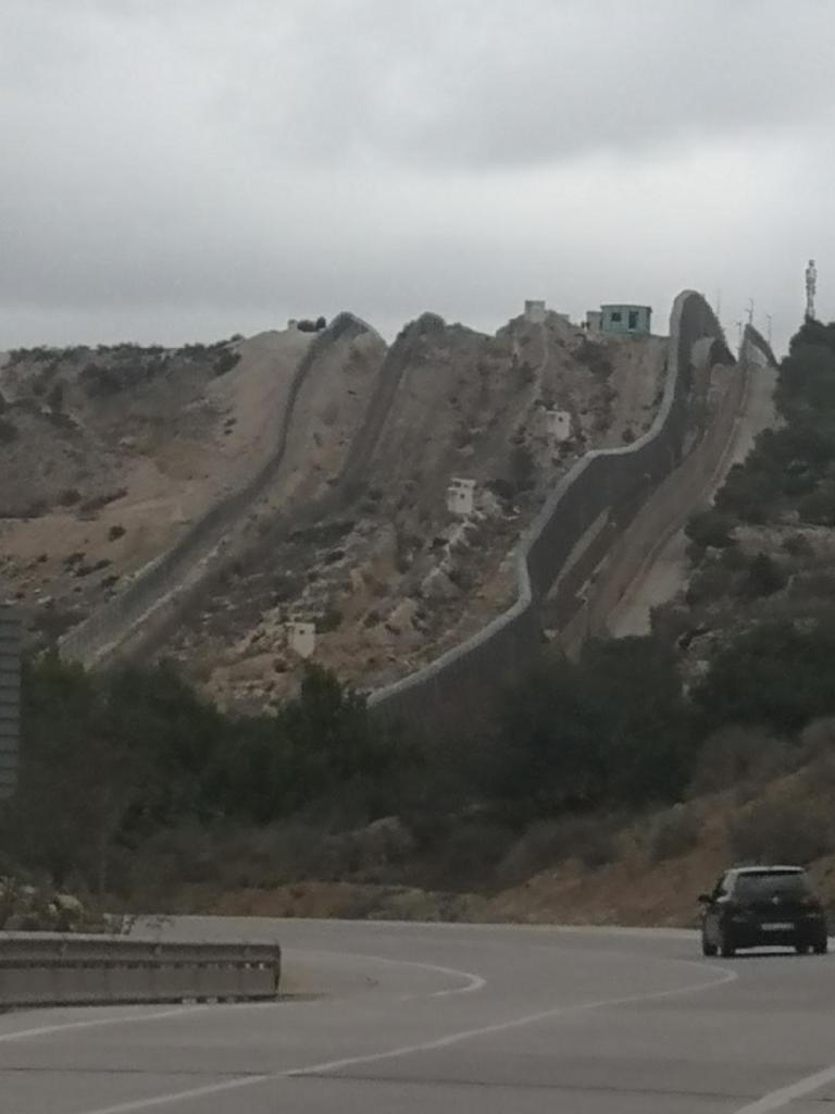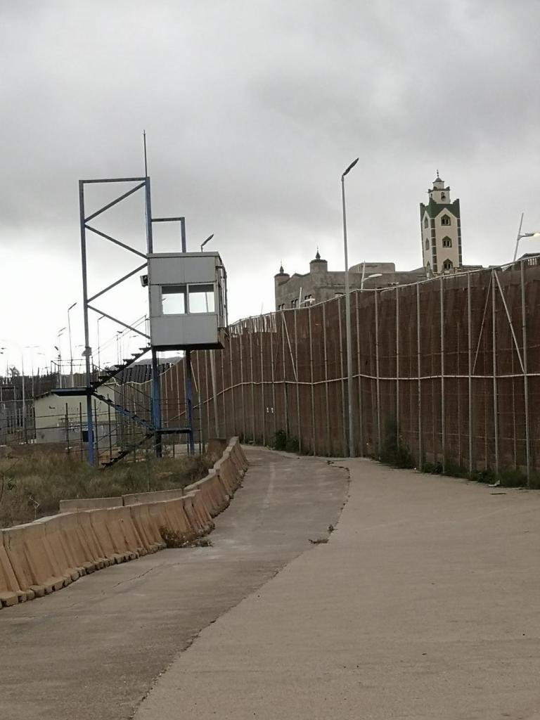 Hier in Höhe der Moschee starben vor einem Jahr viele Flüchtlinge. Auf der anderen Seite reicht das Dorf bis an den Zaun. Der Bürgersteig ist die Grenze. Viele Asylsuchende, die den ersten Draht überwunden hatten, wurden von Spanischem Gebiet aus mit Steinen beworfen, starben zwischen den Drahtverhauen.