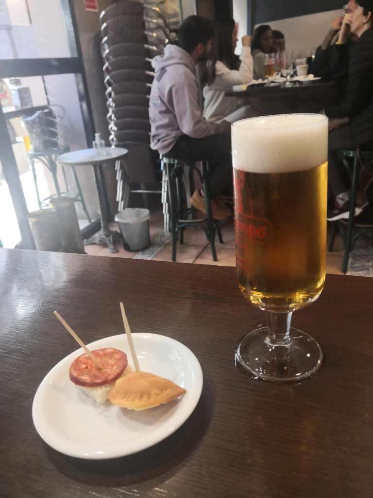 Zum Trost ein Bier. Montags sind viele Restaurants geschlossen. In der Nähe nur eine Art Schnell-Pizzeria. Naja. Wie bei uns im Rewe aus der Truhe.