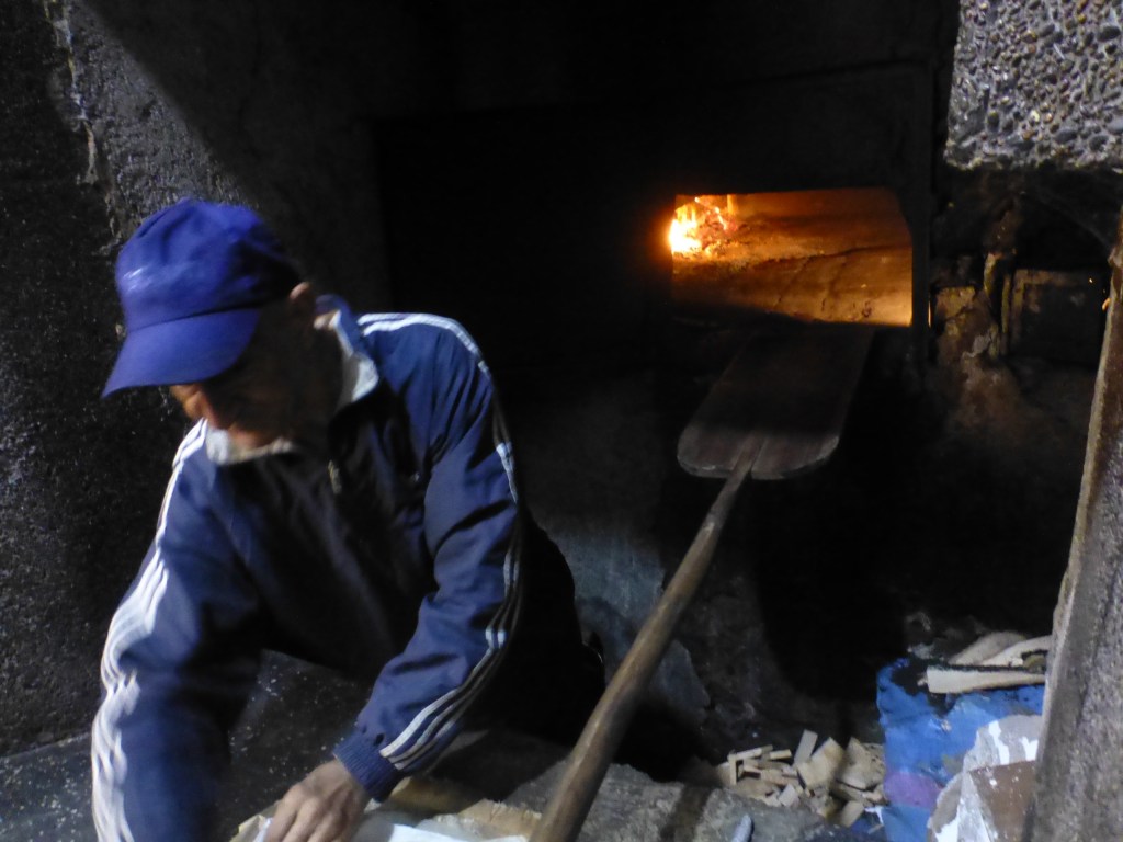 Jemand der gerade Zeit hat, nimmt den Teig mit in die Backstube und dort hockt ein Mensch in einer Grube, hält die Flamme am Brennen und schiebt mit einer riesigen Schaufel die Köstlichkeiten in das gemauerte Steinwerk.