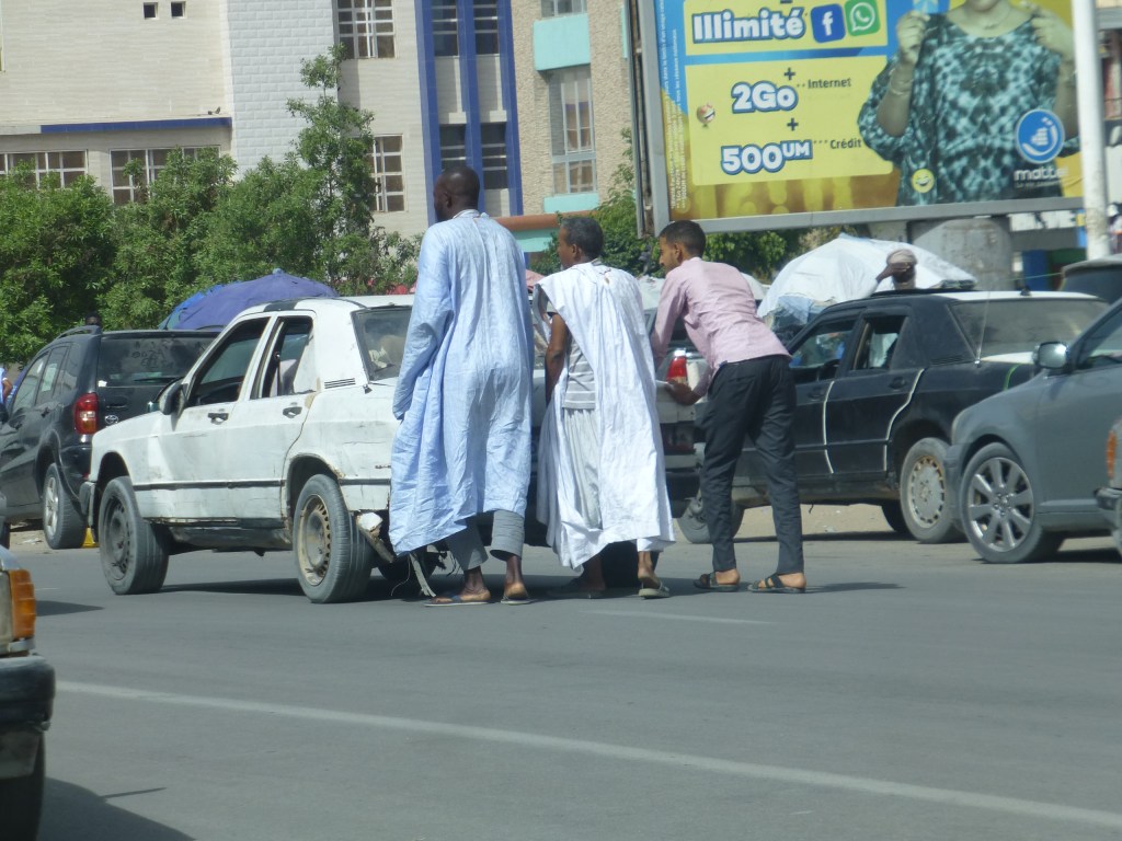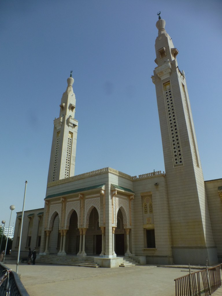 Wenig weiter passiere ich eine riesige Moschee. Ein riesiges Gotteshaus, von den Saudis den Mauretaniern geschenkt. Irgendwie ist das auch blöd. Unsere Entwicklungshilfe kümmert sich um Brunnen, Landwirtschaft, Bildung, Aufbau von Industrien oder Gewerbe während aus dem Nahen Osten die unbegrenzten Ölmilliarden in das Seelenheil investiert werden, in Moscheen in denen uns nicht nur Lobpreisungen gewidmet werden.