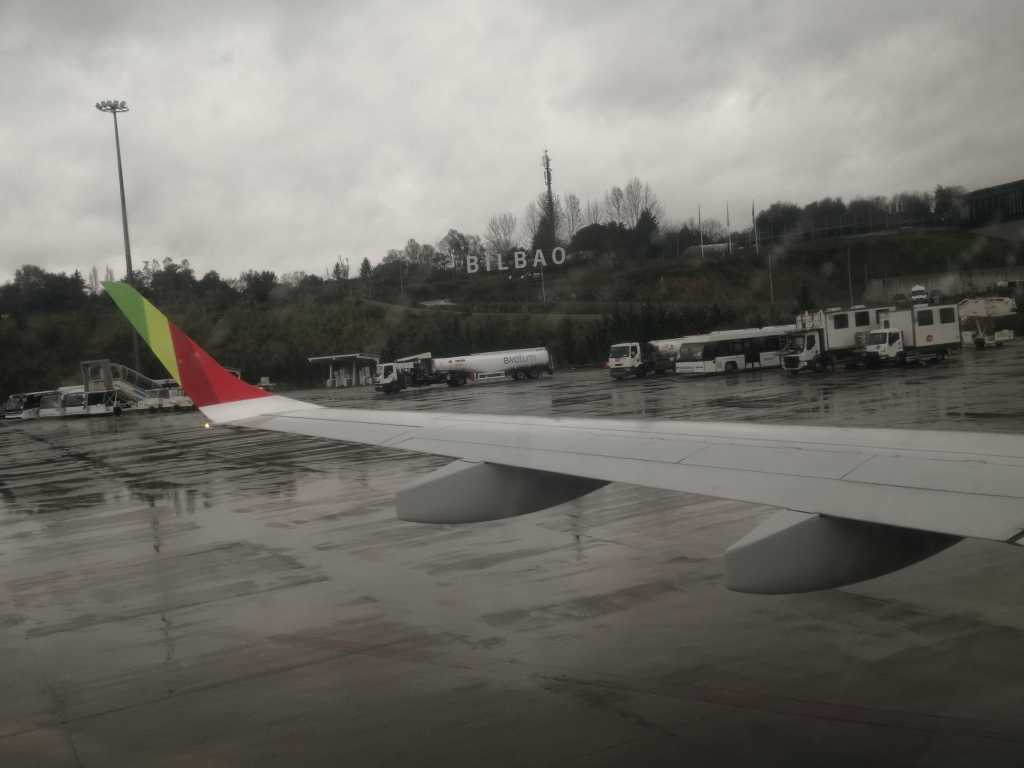 Der Anschluss nach Bilbao in einer kleinen Maschine. Angenehm, obwohl ich die Hälfte des Fluges nur Wolken gesehen habe. Wir sind in eine richtige Suppe eingetaucht. In Bilbao Regen. Codekarte für den Bus hatte ich noch. Einmal umsteigen, direkt vor dem Hotel aussteigen.