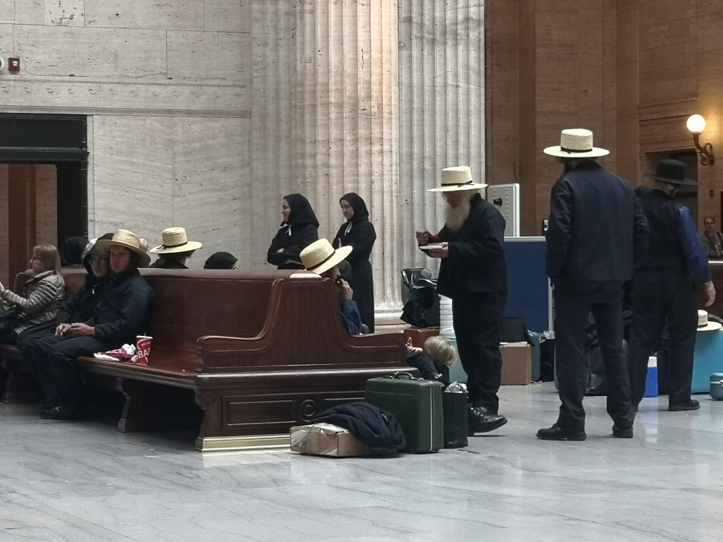 Umsteigen in Chicago. Immer wieder sind viele Amish People in den Zügen zu sehen. Ihre Religion erlaubt keine Modernität, also auch kein Auto und kein Flieger. Die Frauen tragen fast immer Kopftuch und müssen ihrem Mann gehorsam sein. (also gibt es auch bei uns in christlichen Gefilden) Ihre Kleider orientieren sich an dem Outfit des 19. Jahrhunderts. Farben und Art der Kopftücher sind Code, beispielsweise für verheiratet etc. Im mittleren Westen sind sie meist Farmer. Man sieht es an den kräftigen Händen und an den Muskelpaketen der Männer. Warum sie aber bei aller Ablehnung des modernen Lebens in Scharen die Tische von Mc Doof bevölkern, kapiere ich dann doch nicht.