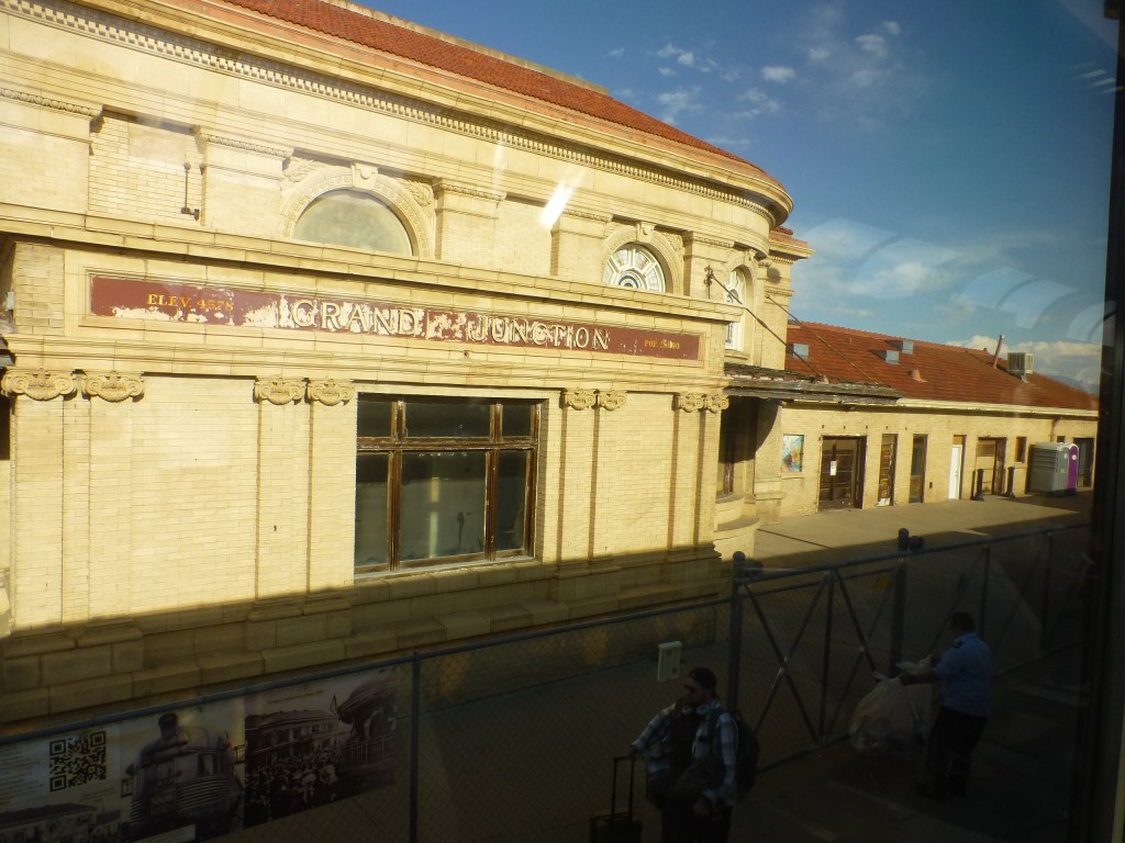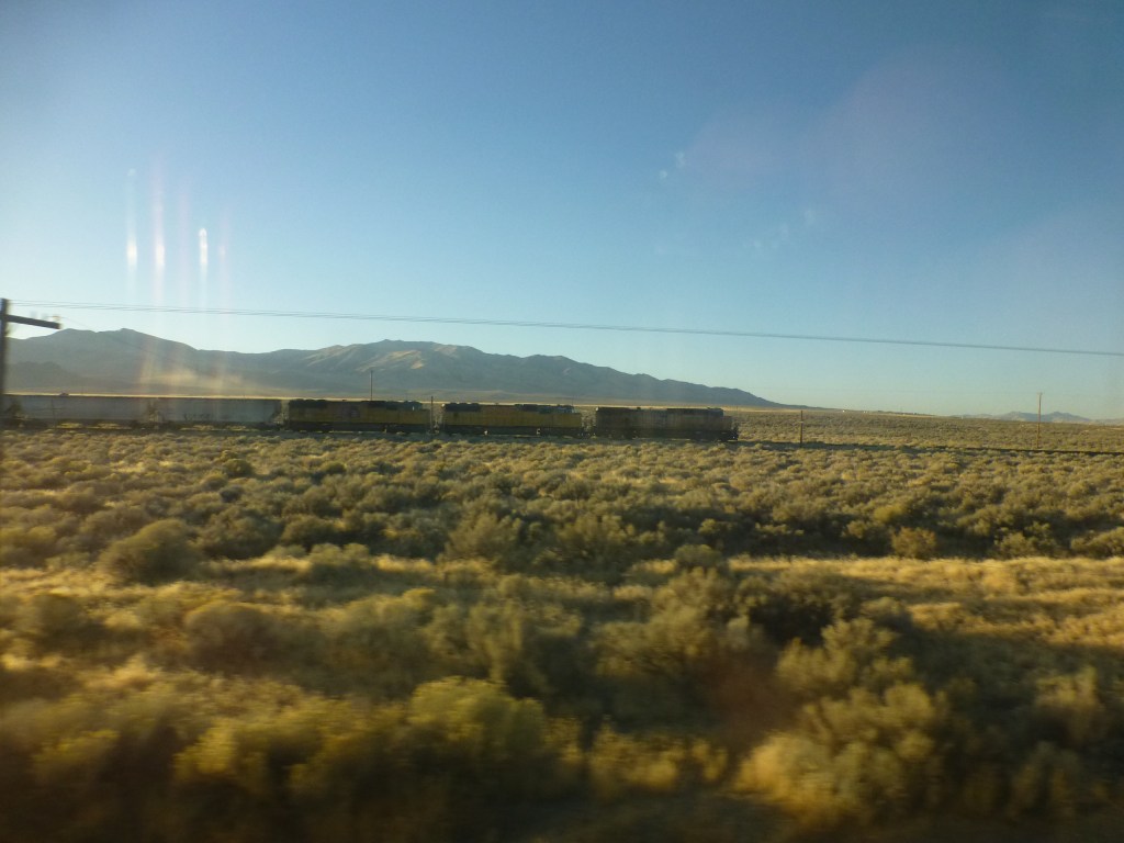 Durch die Wüste von Nevada. Ich habe leidlich gut geschlafen. Unterwegs Halt an einer kleinen Station, die wohl einst ein Eisenbahnknoten war. Viel Rost und Unkraut. Raucherpause. Das stolze Gebäude wartet vergeblich auf einen Käufer. Das Ticketing von Amtrak logiert mittlerweile in einem Güterschuppen.