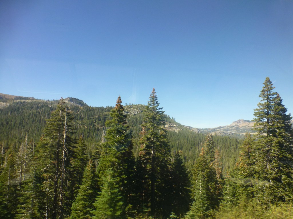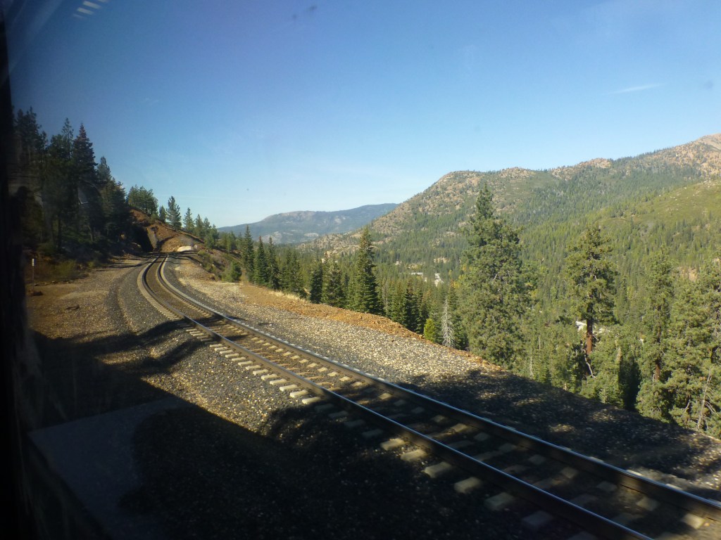 Zeit um zu schreiben bevor es nach einem Stopp in Reno in der Sierra Nevada wieder auf über 2.000 Meter hoch geht. Auch hier verkürzt ein Scheiteltunnel seit 1927 die Strecke. Viele 100 Meter über uns kann man noch den ursprünglichen Trassenverlauf verfolgen. Es ist kaum vorstellbar wie Dampfloks einst die steilen Rampen bewältigten.