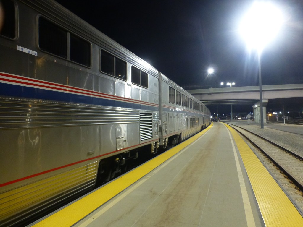 Salt Lake City: die Beine auf dem Bahnsteig vertreten. Noch eine Nacht im Zug schlafen. Ist nicht so schlimm. Der Sitzabstand beträgt einen Meter. Man kann den Sitz fast flach legen inklusive einer Beinliege. Und ich habe keinen Sitznachbarn, kann mich ausstrecken. Die Coach Class ist dünn besetzt. Ich vermute in den Sleeping Cars sieht es nicht besser aus. Amtrak ist beim Ticketing sehr digital aufgestellt. Sobald man auf dem Bahnsteig ist, agiert das Unternehmen sehr personalintensiv. Einchecken dauert. Platzkarten werden mit der Hand ausgeschrieben. An den Bahnhöfen, an denen meist nur zwei Züge am Tag stoppen, jede Menge Leute, die den Zug fit halten. Wasser nachfüllen, Fenster reinigen, Security und und und.. Nebenbei:die Qualität der Imbiss-Bude im Zug hat sich deutlich verbessert.