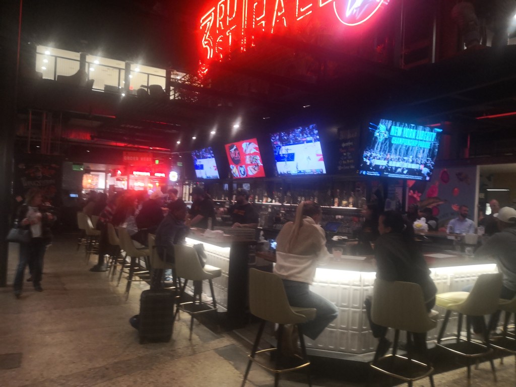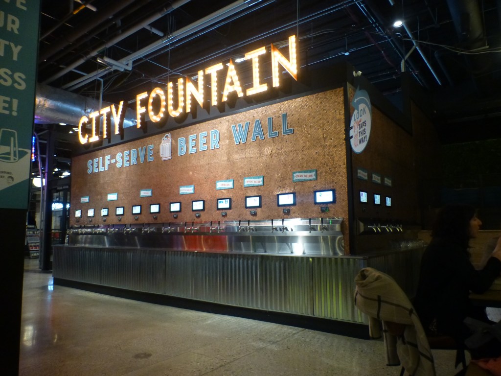 Mich zieht es in die Markthalle. Im Internet stand, dass es hier gutes Essen in großer Auswahl gibt. Ist richtig aber anders als ich mir in das in meinem von Offenbach geprägten Weltbild vorzustellen vermochte. Also keine Essstände mit Produkten vom Viehzüchter oder Gemüsebauernaus der Region mit Organic Touch. Im Prinzip stehen hier 20 bis 30 Foodtrucks ohne Räder und bieten Speisen aus aller Welt vom Döner bis zur Pho, vom Hamburger bis zu Tacos. Der Höhepunkt: die Bierwand. Kreditkarte rein, Gerstensaft raus. Ersetzt den Wirt.