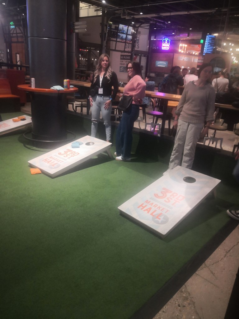So eine Art Boole mit Säcken, die in Löcher geworfen werden. Das ist quer über die Staaten das angesagteste Spiel. Auch in den Fußgängerzonen hoch und runter.