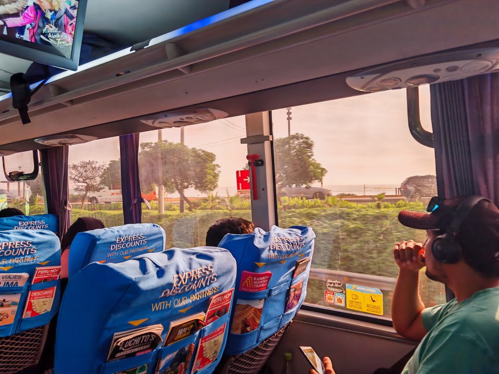 Es gibt so Städte, da fährt ,man zwei Minuten aus dem Airport oder vom Bahnhof und denkt: das ist meine Stadt. Lima ist so ein Ort. Ich fühle mich in 30 Sekunden heimisch. Komisch. Denn der Verkehr ist völlig chaotisch. Für die ersten 500 Meter brauchen wir gefühlt eine halbe Stunde. Um den Flughafen liegen eher die ärmeren Viertel. Im Bus plärrt ein Bildschirm irgendwelche Werbespots: Aber ich habe das Gefühl. Hierkommst Du durch. Über mir die majestätischen Berge der Anden, entlang der Fahrtstrecke pulsiert das Leben. Viele kleine Geschäfte, Cafes.
