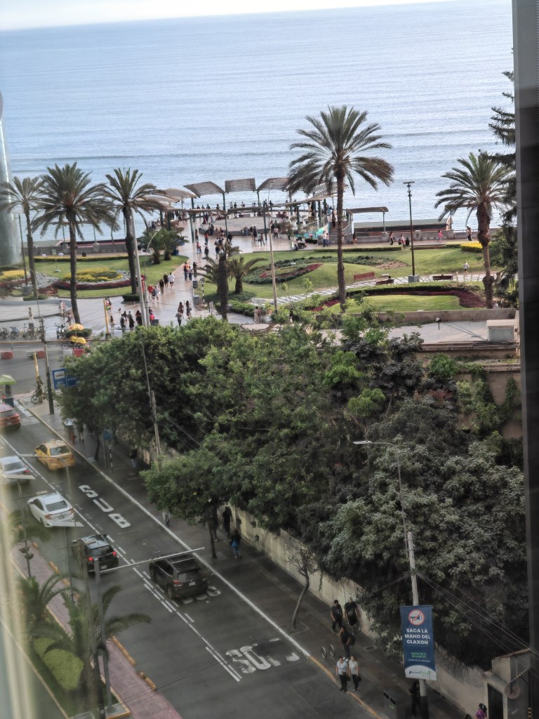 Die große Überraschung: Lima liegt an einer Steilküste. Der Bus fährt auf einer Schnellstraße entlang am Ufer und am Strand. Links Meer, rechts eine Wand: 80 bis 100 Meter hoch. Einige Fußwege mit vielen Serpentinen winden sich durch die Felsen. Da Linksabbiegen in dem Chaos schwierig ist: fährt der Bus immer rechts, rechts, rechts, also riesige Umwege. Aber er hält 50 Meter von meinem Hotel entfernt. Ein Best Western, eher einfach aber sauber und mit einem netten und kompetenten Staff. Mein Zimmer überrascht. Vom Bett blicke ich über die Weite des Pazifik.