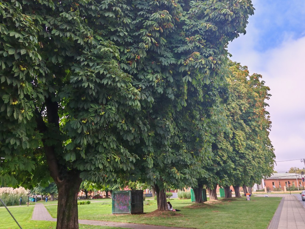 Ich laufe so ungefähr die Richtung die mir Google im Hotel gezeigt hat. Aber irgendwo bin ich falsch abgebogen. Zum Glück, denn so bietet der Tag einige Erlebnisse mehr. Der Anfang ein eher alltägliches. Hier ist Herbst und von unzähligen Bäumen fallen die Kastanien, die einer fleißiger Mensch zusammen fegt und in riesige Boxen schüttet.