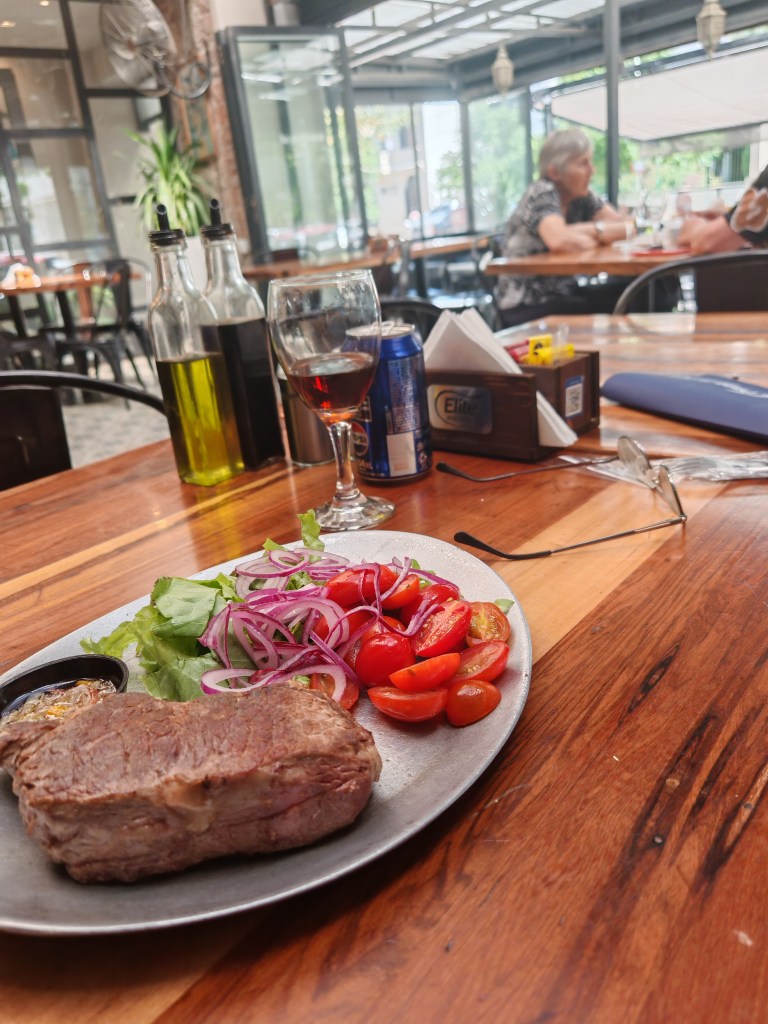 Das Reisebüro liegt in einem Viertel wo eher Besserverdienende wohnen. Schöne Restaurants mit herrlichen Terrassen. Ich beschließe mich mit einem Steak zu belohnen. Und: es ist eine Belohnung.