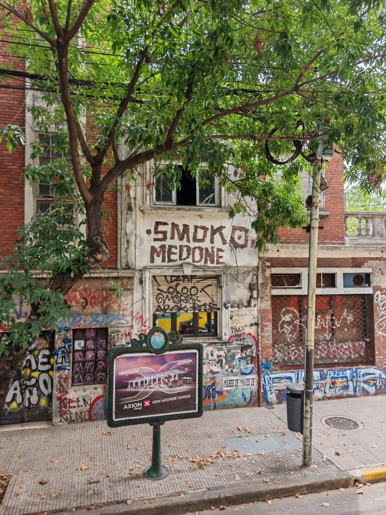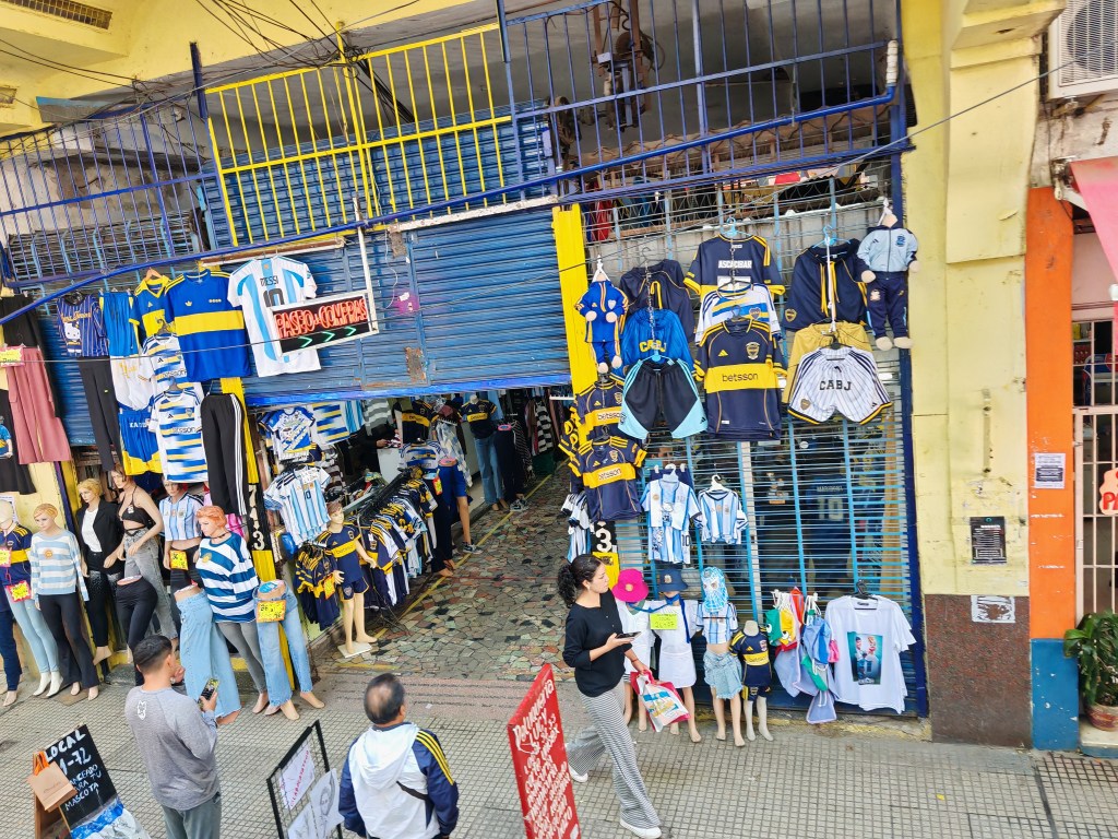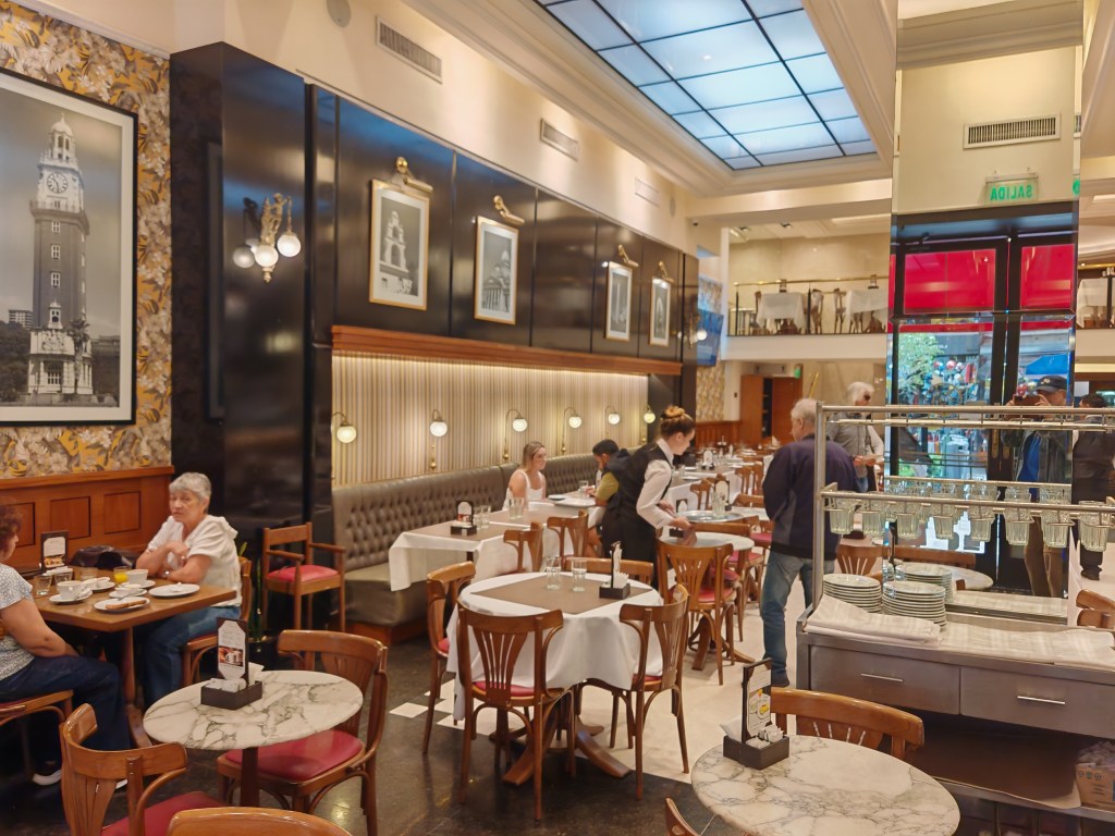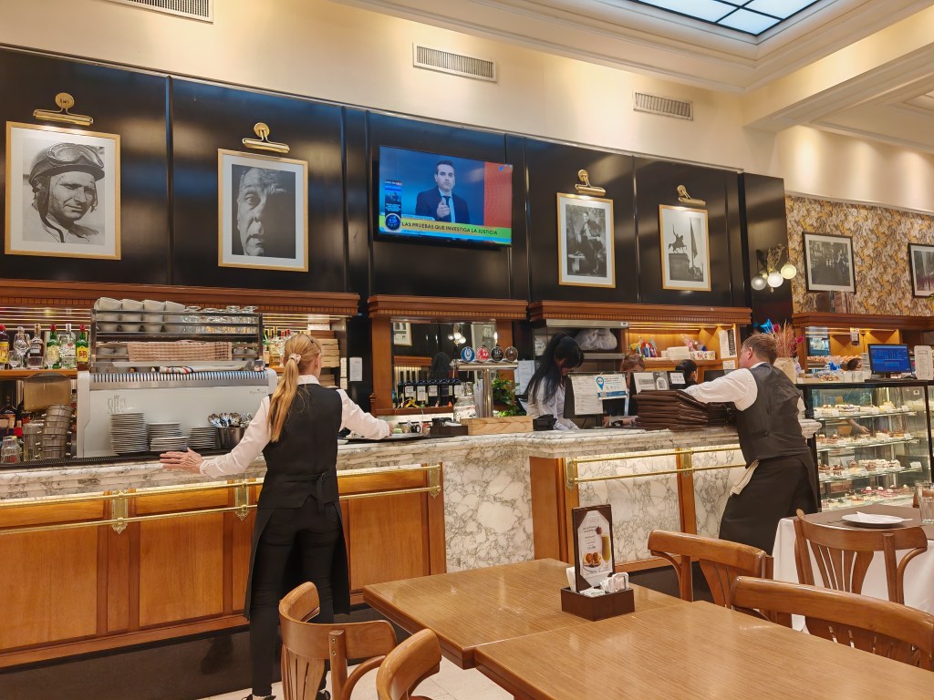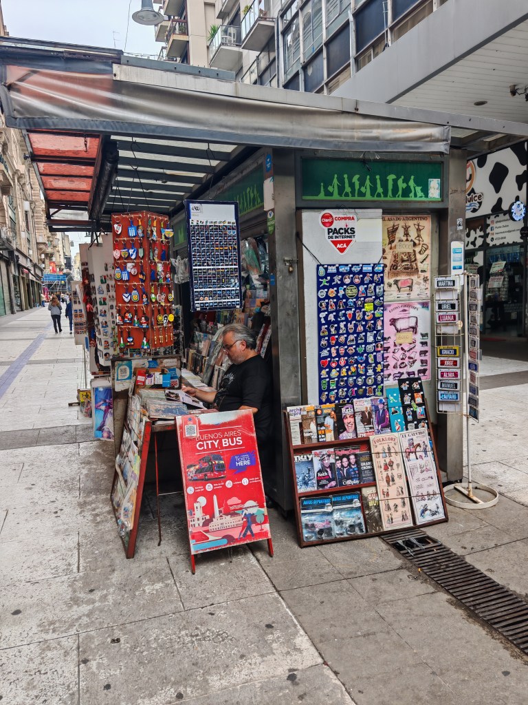 Heute ist ein Brückentag, weil Dienstag irgendwas gefeiert wird. Das Land hat nur eingeschränkt geöffnet. In der Fußgängerzone nebenan haben zwei wunderschöne alte Cafés geöffnet. Zeugnisse der großen Kaffeehaus Tradition der argentinischen Hauptstadt. Es fällt schwer sich zu entscheiden. Im Quartier hier dominieren Gebäude im Stil des Klassizismus. Eine wohlhabende Gegend, zumindest einst. Ein paar exquisite Geschäfte verteilen sich noch entlang der Straße: Herrenschneider, edle Zigarren und Weine, Porzellan. Mode die noch nicht von Hilfiger, Ralph Lauren und North Face bestimmt wurde. Es sind nur noch wenige. Es dominieren Souvenir-Shops, gefakte T-Shirts, China-Handtaschen, Kühlschrankmagnete und Maradona-Trikots. Die wenigen Fachgeschäfte werden mit der Rente ihrer Besitzer auch bald verschwunden sein.