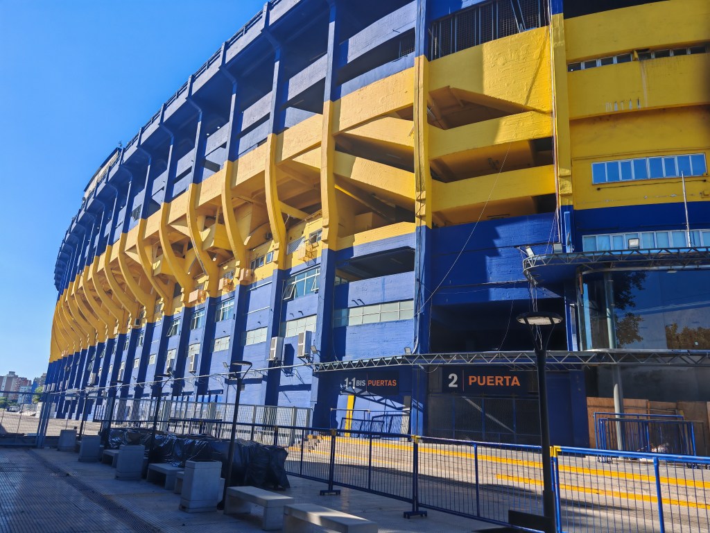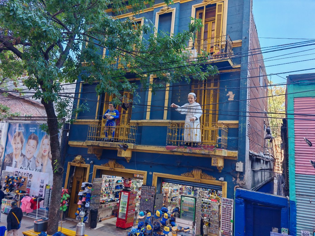 Aber eigentlich scheint hier nur eine Farbkombination möglich: das Blau gelb des Fußballclubs. Ganze Straßenzüge tragen dieses Kolorit. Ohne Nuance. Boca direkt am Ufer des Rio del la Plata, wurde ursprünglich von den Italienern, meist aus Genua, besiedelt. Der Ort lebte vom Hafen, von den Menschen die hier ankamen. Der Fußball wurde wahrscheinlich von den Italienern importiert. Es gab zwei Clubs, beide trugen die gleichen Farben, ihren Plätze nur wenige hundert Meter voneinander entfernt. Zwei Vereine, eine Farbkombination: das musste bei einem Fußballspiel geklärt werden. Boca verlor und musste sich für eine neue Töne entscheiden. Am nächsten Morgen ankerte ein schwedischer Frachter mit den Landesfarben blau gelb. Diese Kombination gefiel den Verantwortlichen des Vereins so gut, dass sie bald ihre Trikots so färbten.